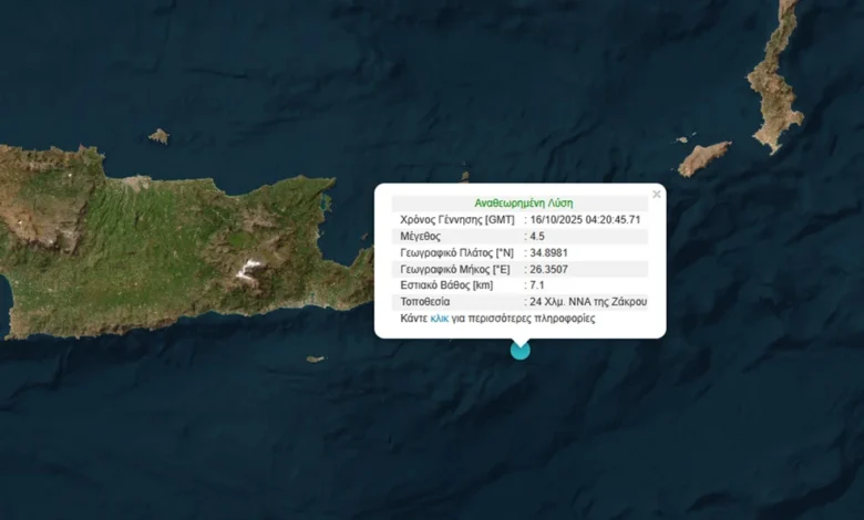 Το επίκεντρο εντοπίζεται 24 χλμ. νότια-νοτιοανατολικά της Ζάκρου, σύμφωνα με το Γεωδυναμικό Ινστιτούτο Αθηνών.
