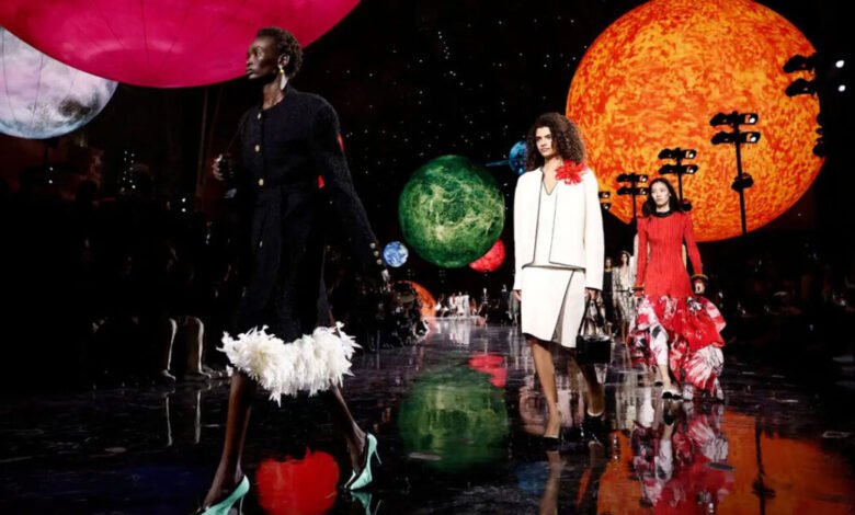 Το σκηνικό θύμιζε κάτι από διαστημική φαντασία — τεράστιες, καθρεφτιστικές σφαίρες σε ένα δάπεδο που έλαμπε, δημιουργούσαν ένα σκηνικό που θύμιζε τις εντυπωσιακές παραγωγές της εποχής Lagerfeld.