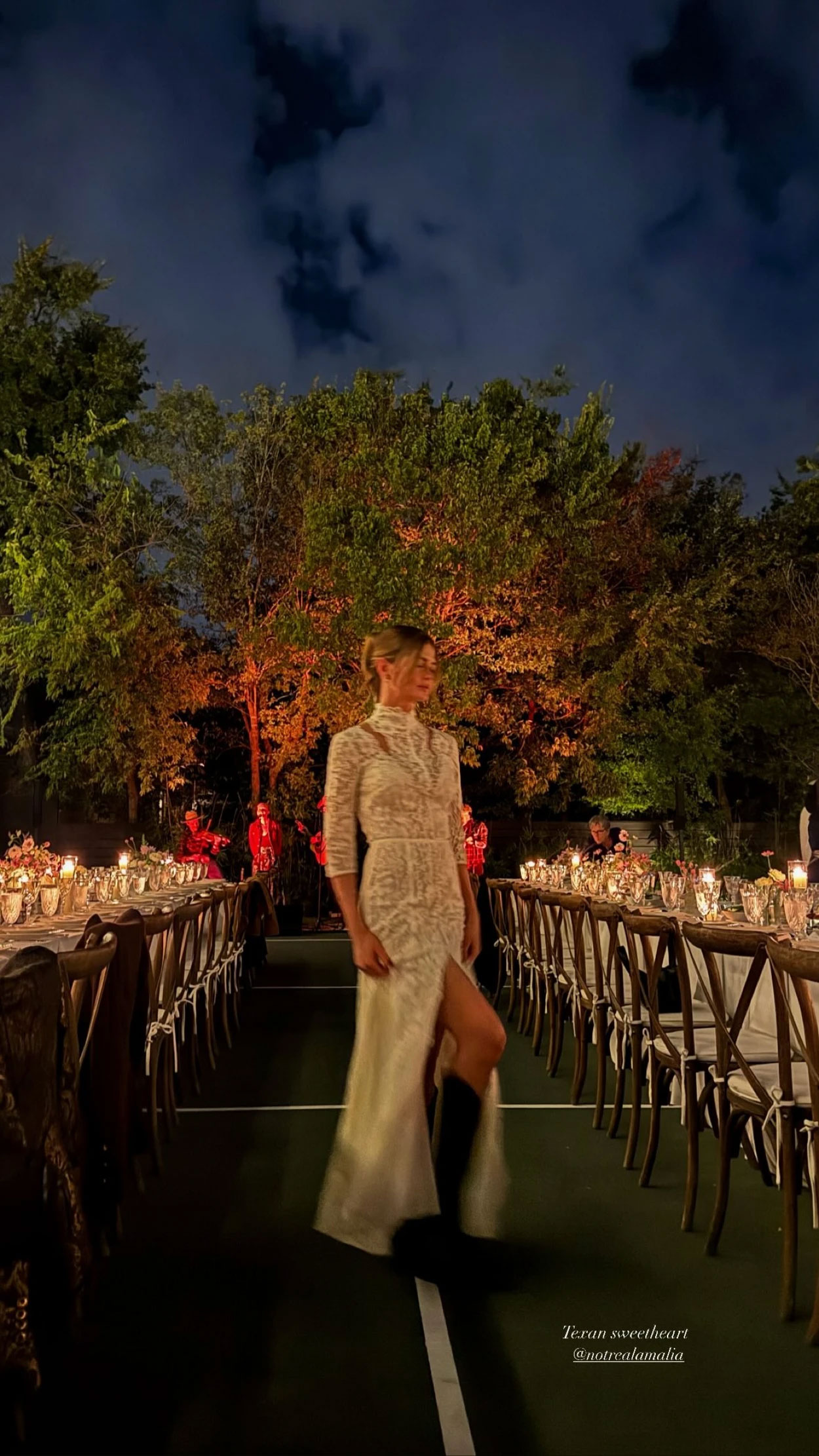 Το μακρύ, ρομαντικό φόρεμα με μακριά μανίκια, ψηλό λαιμό και διακριτικά cut-outs στο μπούστο συνδύαζε τη λεπτεπίλεπτη θηλυκότητα με μία μοντέρνα πινελιά χάρη στο σκίσιμο στο πλάι. Το look της ολοκλήρωσαν μαύρες δερμάτινες cowboy μπότες, που έδωσαν ένα ανεπιτήδευτο, country-chic ύφος, απόλυτα ταιριαστό με την ατμόσφαιρα του Τέξας.