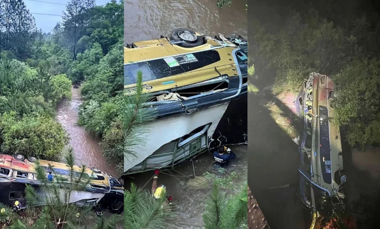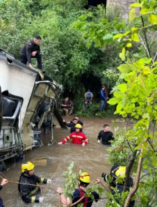 Ως αποτέλεσμα της σύγκρουσης, το λεωφορείο πήρε κλίση και έπεσε από τη γέφυρα στην κοίτη ενός ποταμού, σε βάθος αρκετών μέτρων.