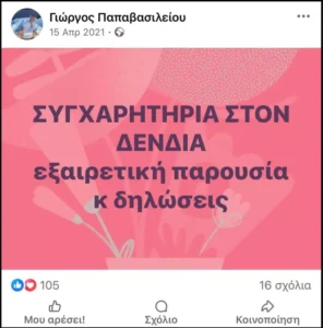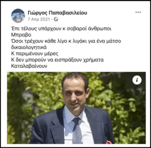 Επίσης, στις 7 Απριλίου 2021 πάλι σε ανάρτηση στο Facebook, έγραφε θετικά λόγια για τον τότε γενικό γραμματέα του Πρωθυπουργού, Γρηγόρη Δημητριάδη.