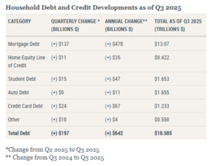 Σύμφωνα με τη νέα έκθεση που καταρτίζει παραδοσιακά η περιφερειακή Fed της Νέας Υόρκης, τα συνολικά χρέη των αμερικανικών νοικοκυριών αυξήθηκαν περαιτέρω κατά 197 δισ. δολάρια μέσα στο τρίτο τρίμηνο φτάνοντας έτσι σε νέα υψηλά στα 18,59 τρισ. δολάρια.