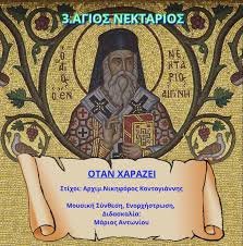 Σηλυβρίας τὸν γόνον καὶ Αἰγίνης τὸν ἔφορον, τὸν ἐσχάτοις χρόνοις φανέντα ἀρετῆς φίλον γνήσιον, Νεκτάριον τιμήσωμεν πιστοί, ὡς ἔνθεον θεράποντα Χριστοῦ, ἀναβλύζει γὰρ ἰάσεις παντοδαπὰς τοῖς εὐλαβῶς κραυγάζουσι. Δόξα τῷ σὲ δοξάσαντι Χριστῷ, δόξα τῷ σὲ θαυματώσαντι, δόξα τῷ ἐνεργοῦντι διὰ σοῦ πᾶσιν ἰάματα.