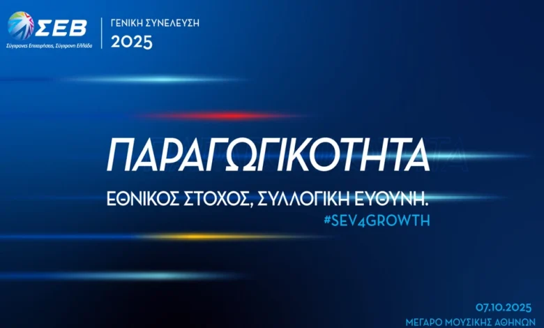Με κεντρικό μήνυμα «Παραγωγικότητα: Εθνικός Στόχος, Συλλογική Ευθύνη» #SEV4Growth πραγματοποιείται, την Τρίτη 7 Οκτωβρίου 2025 στις 19:00, η Ανοιχτή Εκδήλωση της Ετήσιας Γενικής Συνέλευσης του ΣΕΒ, στο Μέγαρο Μουσικής Αθηνών, αίθουσα «Χρήστος Λαμπράκης» (κατόπιν πρόσκλησης).