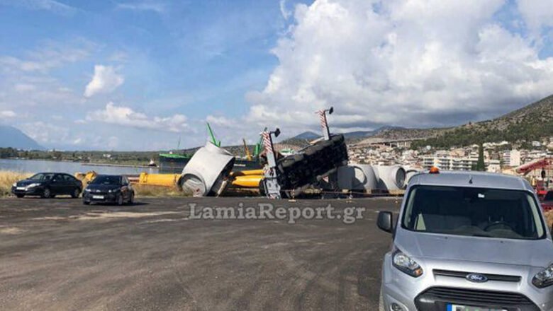 Ένας μεγάλος γερανός που είχε επιστρατευτεί για τη φόρτωση τμημάτων ανεμογεννητριών, ανατράπηκε πλησίον του τελωνείου Στυλίδας το πρωί της Τρίτης 30/9/.