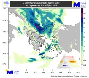 Την Παρασκευή 3/10 βροχές και καταιγίδες, κατά τόπους ισχυρές αναμένονται αρχικά στην Κεντρική και Ανατολική Μακεδονία, στη Θράκη, στο Αιγαίο και στην Κρήτη ενώ τοπικές βροχές και ενδεχομένως καταιγίδες θα εκδηλωθούν και στο Ιόνιο και στα δυτικά ηπειρωτικά. Από το πρωί τα φαινόμενα σε Κεντρική και Ανατολική Μακεδονία, Θράκη και Αιγαίο θα εξασθενήσουν σταδιακά.