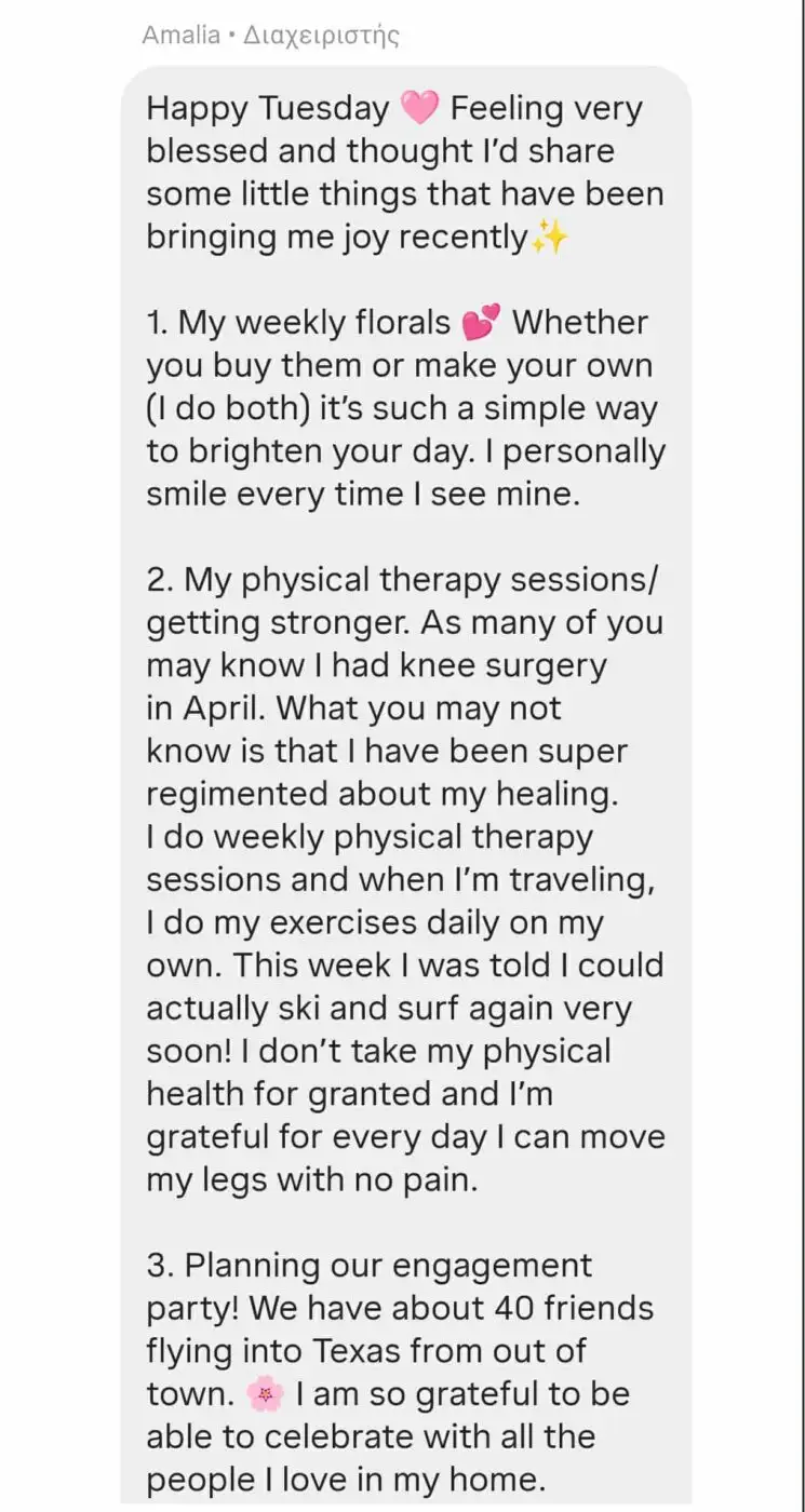 «Νιώθω πολύ ευλογημένη και σκέφτηκα ότι θα ήθελα να μοιραστώ μερικά μικρά πράγματα που μου φέρνουν χαρά τις τελευταίες ημέρες» γράφει αρχικά η Αμαλία Κωστοπούλου, αποκαλύπτοντας στη συνέχεια: «Διοργανώνω το πάρτι αρραβώνων μου! Έχουμε περίπου 40 φίλους που θα πετάξουν στο Τέξας από άλλα μέρη. Είμαι τόσο ευγνώμων που θα μπορέσω να το γιορτάσω με όλους τους ανθρώπους που αγαπώ στο σπίτι μου».